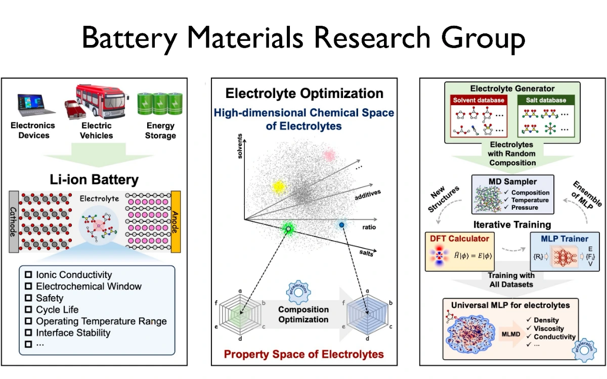 电池材料研究小组专注于电池体系物化性质计算、电解液知识图谱构建与智能配方设计,旨在通过 第一性原理计算、分子动力学模拟、自由能微扰理论、深度学习神经网络 以及 大语言模型 等前沿技术,实现从微观物理化学性质到宏观性能评估的端到端智能化研究。小组成员来自材料科学、化学、计算机科学等多个交叉学科领域,致力于构建全面精确的储能材料数据库及通用势函数模型,并结合实验数据推动电解质和电池材料智能化设计与优化,推动材料与能源科学等领域的理论发展。