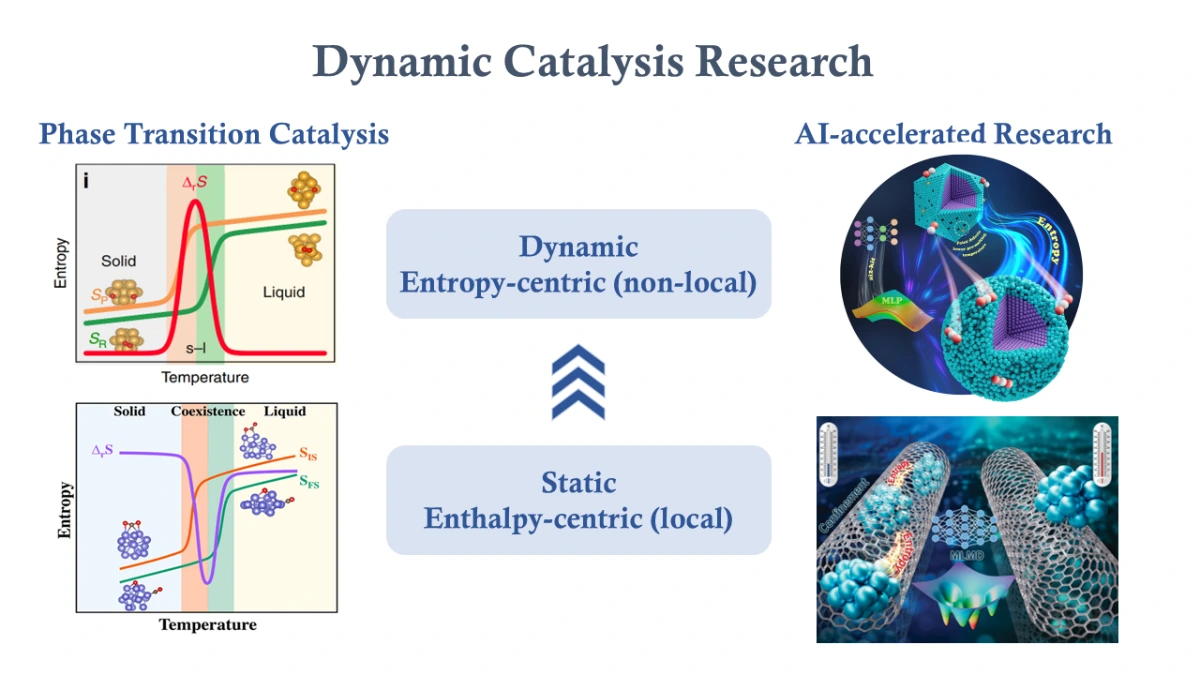 多相催化体系在反应条件下表现出高度的动态性,其中催化剂结构的动态演变对催化反应性能有相当大的影响。然而,传统的理论催化研究通常聚焦于催化剂的静态稳定或亚稳态结构,进一步理解催化剂的原位动态演化对理解反应机理和优化反应活性具有重要的意义。 在之前的工作中,我们通过AIMD和自由能计算方法研究了催化剂结构演化与基元反应之间的动态耦合效应。在此基础上,我们使用自主研发的 ai2-kit 工作流高效训练具有第一性原理精度的机器学习势函数,进一步探究纳米团簇表面预熔和载体限域效应对催化反应的影响。 未来,我们将借助高效的人工智能方法模拟更加真实的复杂催化体系,以期从原子尺度对原位环境下的动态催化过程进行更加深入的理解,并通过高通量计算理性设计和筛选催化剂。