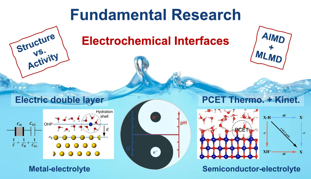 电化学基础研究小组专注于电化学反应的本质机理与理论框架,特别聚焦于电化学界面、催化反应及质子耦合电荷转移等核心问题。通过构建创新的理论模型与高效计算方法,深入研究界面结构(如电荷分布和双电层等)对电化学过程的影响,揭示电化学反应的微观机制,并结合实验数据推动材料设计与优化。小组旨在为电化学领域的前沿技术提供理论支持,并为能源、环境等应用领域的科学发展提供坚实的理论基础。